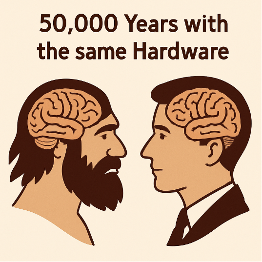 Desde la neurociencia y la antropología genética sabemos que el cerebro y la mente del Homo sapiens de hace 50.000 años eran, en lo esencial, iguales a los nuestros. Con un volumen cerebral promedio de 1350 cm³ y una arquitectura prácticamente idéntica, estos primeros humanos poseían ya las capacidades cognitivas fundamentales: lenguaje, memoria, razonamiento abstracto, sentidos y empatía social (Skoglund & Mathieson, 2018). No eran criaturas primitivas en lo mental, sino sapiens plenos. Aunque algunos estudios sugieren que presiones epigenéticas recientes pudieron haber modelado ligeramente ciertas regiones cerebrales, lo cierto es que la maquinaria básica cognitiva de la mente humana ha permanecido notablemente constante, incluso en medio de transformaciones culturales y tecnológicas vertiginosas (Hawks et al., 2007).