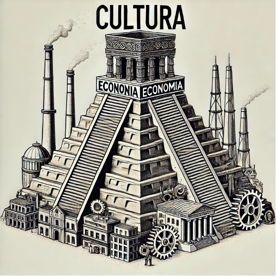 Esta imagen representa una cosmovisión biopsiquica y biosocial: el ADN —que codifica en la potente mente sapiens los algoritmos de las pasiones, deseos, placeres, instintos, emociones, sentimientos, conciencia, razón y capacidad de abstracción— es la verdadera infraestructura, la base sólida sobre la que se alza el edificio de la cultura y las civilizaciones