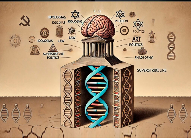 De esta manera, todo el andamiaje cultural que estudian las ciencias humanas y sociales: —economía, leyes, ideologías, arte, política, derecho, justicia, democracia, religiones, creencias, mitos—, no emergen del capital ni del trabajo, sino de las capacidades mentales cableadas a priori por millones de años de evolución biológica. Así, toda la superestructura cultural está soportada, en última instancia, por la estructura genética