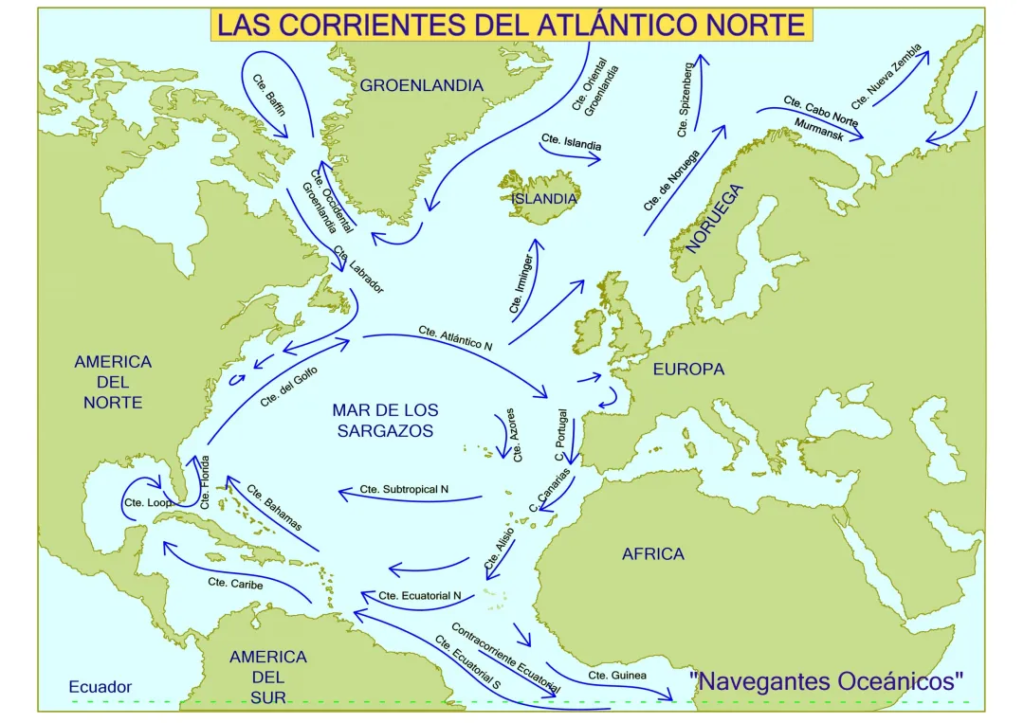 Figura 3. Las corrientes del Atlántico Norte. Publicado por Juan González-Aller Lacalle | Mar 23, 2023 | Meteorología y Oceanografía para Navegantes Oceánicos
